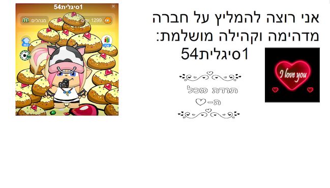 אני רוצה להמליץ לכם על חברה מדהימה וקהילה מושלמת, תכירו את 1סיגלית54, יש לה קהילה מלאה ביצירות והמון עוקבים, והיא ללא ספק חברה מושלמת.