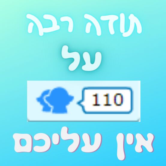 תודה רבה לכולכם על110 עוקבים באמת תודה לכל עוקב ועוקב היום גם היסתכלתי וראיתי שזה כבר 120 עוקבים {פשוט שעשיתי את היצירה היו רק 110 עוקבים ואין לי זמן לעשות יצירה חדשה}אבל באמת תודה רבה רבה לכולכם גם ל10 החדשים מאתמול באמת אין עליכם בעולם כולו כל אחד ואחד ממכם חשוב אין עליכם בעולם ועכשיו לכבוד110 עוקבים ולכבוד היומולדת שלי יש משימה תעשו יצירה שבו אתם משלבים ביון המספר110 לבין חגיגת ימולדת אתם מוזמנים לעשות את זה בכל דרך שתרצו יש להקדיש לי את היצירה בימים הקרובים אני יעלה דוגמא שהכנתי בעצמי