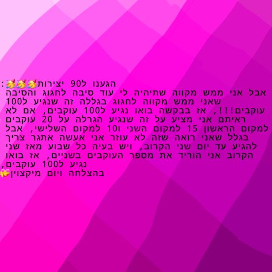 הגענו ל90 יצירות: אבל אני ממש מקווה שתיהיה לי עוד סיבה לחגוג והסיבה שאני ממש מקווה לחגוג בגללה זה שנגיע ל100 עוקבים!!!, אז בבקשה בואו נגיע ל100 עוקבים, אם לא ראיתם אני מציע על זה שנגיע הגרלה על 20 עוקבים למקום הראשון 15 למקום השני ו10 למקום השלישי, אבל בגלל שאני רואה שזה לא עוזר אני אעשה אתגר צריך להגיע עד יום שני הקרוב, ויש בעיה כל שבוע מאז שני הקרוב אני הוריד את מספר העוקבים בשניים, אז בואו נגיע ל100 עוקבים, בהצלחה ויום מיקצוין