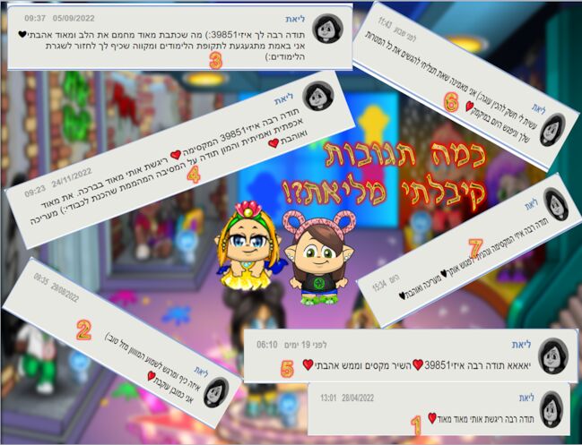 יציאה לי עריכה לא יפה :( עמוסה מאוד :( אזזז כמה תגובות קיבלתי מליאת?! - 7! ממוצע התגובות שלי מליאת הוא - כל 13 יצירות תגובה! וממוצע תגובות המנהלים שלי זה - כל שמונה יצירות תגובה! אממ... תוכלו לראות שאת אחת התגובות קיבלתי היום :) נ.ב תודה רבה למנהלת ליאת שבמפגש שלי איתה הוסיפה לי - חולצת מונדיאל, את השיער שהיא לובשת כרגע ואת הצבע של המיקמק שלה. תוד הרבה לליאת ולקהילה שלי. הודעות סופר חשובות!!! - יצירה המאה מתקרבת... הכנתי כבר יצירה! למישהו יש רעיונות ליצירת המאה?! מי שידע מה הרעיון של יצירת המאה יקבל הפתעה- את ההפתעה תגלו ביצירת ה100
