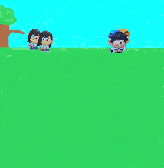 היי אז עשיתי ציור שוב במחשב עם תמונות. עשיתי שתי בנות זהות ליד העץ שרוקדות אותו ריקוד ואותו קצב. שלושת הבנים יושבים להם על השדה ומביטים בבנות. הבנות ממשיכות לרקוד לרקוד לרקוד לרקוד לרקוד..... והבנים מסתכלים מסתכלים מסתכלים..... ובסוף הבנים מצטרפים אל הבנות לאותו ריקוד ואותו קצב. ובסוף הם רקדו ורקוד ולא יצא מזה שום סיפור...