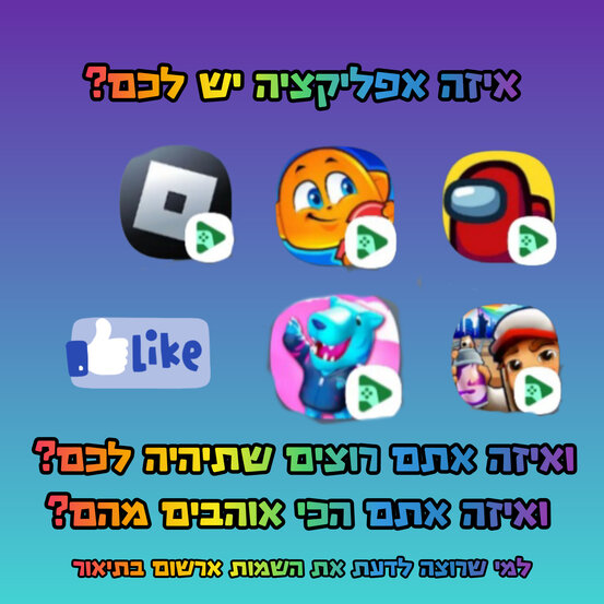 רובלוקס אמונג אס כמובן מיקמק! את הרכבות(גם לי אין כוח לכתוב באנגלית). למרות שזה כיף רק כשאין אינטרנט או מחכים למשהו.. ומה זה האחרון? |