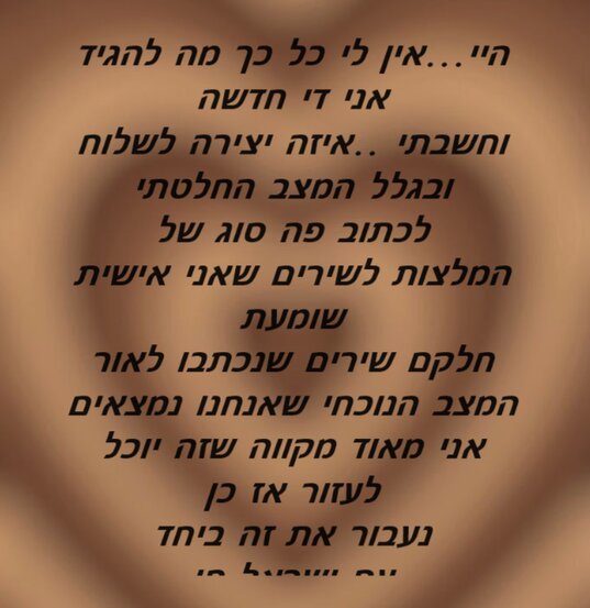 היי אז כן חח זאת היצירה הראשונה שלי ואני מקווה בעזרת ה שהיו עוד אז כן [משום מה אני כותבת מלא כן ]בקיצור חשבתי על מה לעשות את היצירה וחשבתי אולי לשתף אותכם בשירים שאני שומעת וכן אני מאוד השמח שתכתבו לי בתגובות שירים שאתם שומעים ואם תרצו אני אעשה עוד יצירה כזאת אז כן אבה נתחיל ששון איפרם שאולוב-נתראה בגלגול הבא חן פורתי-מה יהיה כאן מאור אשכנזי-השיר של עומר איזי-שבע באוקטובר נאורי עמרם-עם הנצח מקווה שאהבתם ומקווה בכלל שזה אשלח וזהו ביי עם הנצחחחח לא מפחד