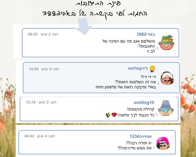 היוש מופלאים מדהימים שלי מה המצב!? מקווה שהכל יהונתני במיוחד❤ היום עשיתי את פינת התגובות החמות לפי שבאדי3882 ביקשה מימני ❤❤❤❤ תודה ל: באדי3882 לירוןמלפפו smiling10 וטחינה1234 ______________________________________ רוצים לוגו? מה אתם עושים? כותבים בתגובות אני אשמח ללוגו! ולהוסיף משפט שאתם רוצים שיהיה בלוגו(לא חייב) ______________________________________ אין לכם מוטיבציה לכלום? כנסו לקהילה שלי ותסכלו על הטיפים! יש כרגע 3 חלקים של טיפים למוטיבציה! אז למה את מחכים?????. ______________________________________ #מלחמת חרבות ברזל# #ביחד ננצח# #עם ישראל חיי וקיים# אנחנו נקסח אותם# #אנחנו לא מפחדים.# עם ישראל פה חזקים#