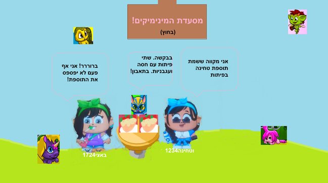 היי חברימוס! אז עצבתי מסעדה שנקראת "מסעדת המינימיקים"!!! ואיך אפשר שלא לשכוח את המינימיקים!!! כפיים כפיים כפיים... .... טוב טוב טוב.. להספיק להפסיק אז עצבתי מסעדה שהכל בחוץ אוכל, מטבח ועוד וכמו שאתם רואים אני במסעדה!! אבל מי יושבת מולי? אובכן חברים וחברות קבלו במחיאות כפיים את וטחינה!!! (זה הלוק האחרון שראיתי שהיא שמה. זאת באמת היא) והיא באה איתה למסעדה להתפנק במאכלים ממקמקים! וכמובן שהיא לא תאכל שום דבר בלי טחינה! תוכלו להתפנק ממש ואפילו אפשר לשחק עם המינימיקים בסביבה! ממליצה ללכת וזהו! נראה שחפרתי כמו שצריך אז נתראה בפעם הבאה!!