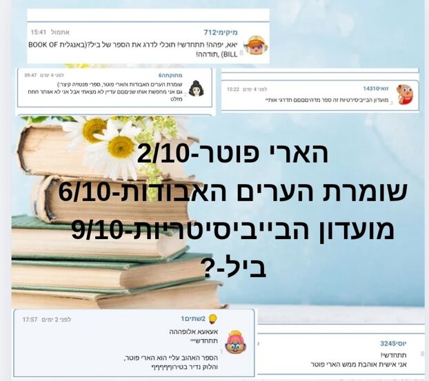טוב חבריייים הגיע הזמן 1שתיים2 וואו לא ידעתי שזה ככה אצלך זואי14310 פעם הבאה יוסי3245 זה פשוט לא טוב לפחות מבחינתי 8חדגה תודה באמת אמילi בפעם הבאה סליחה לכל נפגעי ונפגעות הארי פוטר ותודה לעוקב ה45 שעוזר לי להגיע לחמישים שנגיע לחמישים תהיה הגרלה אגב, על מה אתם רוצים על ההגרלה? אמריקה1103 |