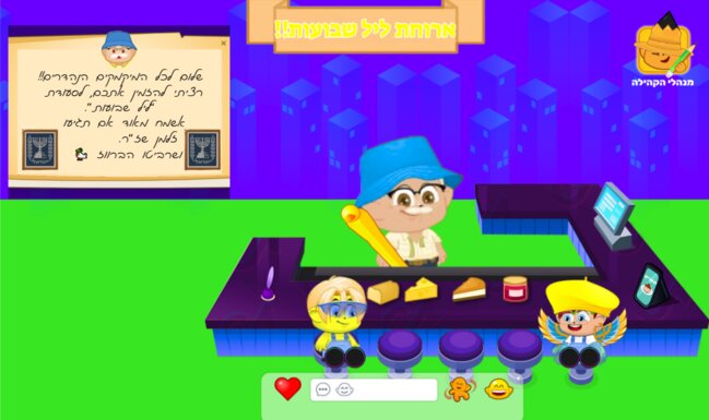 לצידו יושבים שני מיקמקים שמחים, והאווירה כולה מלאה בשמחה ואור. בצד שמאל של המסך תלויה מגילה ובה ברכה מהממלכה, עם ספרי תנ"ך קטנים שמוסיפים נופך יהודי ומסורתי לחג.