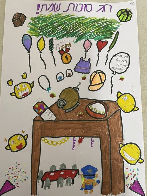 אני רוצה לכתוב פה מה ציירתי: ציירתי קופסא בצורת סוכה שבתוכה יש מלא פריטים שהמצאתי להם עיצוב חדש ציירתי את האימוגים של מיק מק ובלונים בצורת ארבעת המינים רואים אותי בתוך הסוכה מזמינה אותכם פנימה משימה:תוכלו למצוא חמש סוכות שמסתתרות בתמונה?
