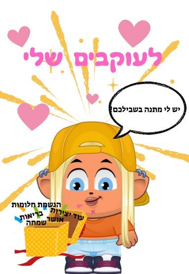 היי! חזרתי להעלות בלוג הפרס ומיקשימה (שתעלה בקרוב!) והכנתי את המתנה ל... לעוקבים שלי! לכם! (עם אתם לא עוקבים זה הזמן) בריאות, אושר, שמחה, הגשמת חלומות ועוד יצירות שלי כמובן מקווה שאזכה שבת שלום! ואיך עבר עליכם החג? נ"ב עוד מעט אירוע ה100 והבטחתי לכם שלא ריאתם דבר כזה במיקמק 2 תעקבו לפרטים נוספים