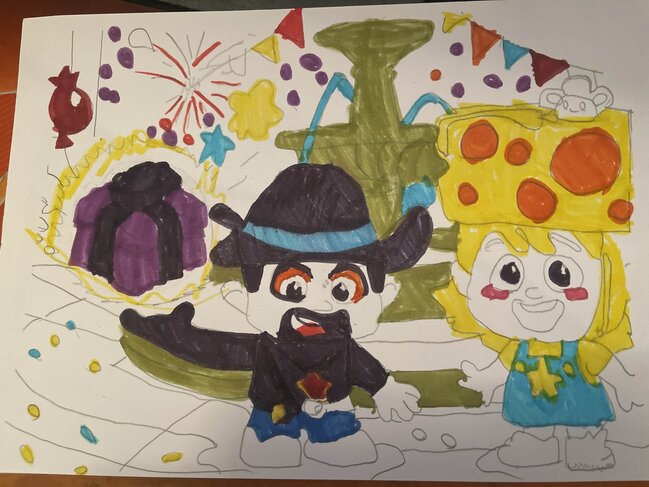 זה הציור שלי שלי לבלוג הפרס!! המתנה שלי לשנה החדשה היא כדור שקוף גדול שכשהוא נפתח יוצאים ממנו מלא זיקוקים בלונים וממתקים מיוחדים. הכדור מורכב מכל מיני קפסולות שכל קפסולה זה מתנה אחרת אחת זה בגד נדיר אחת חפץ מקושט ואולי אפילו מסר אישי לשנה החדשה. אם זה שהמתנה מכוונת למישהו אחד ברגע שהיא נפתחת כולם יכולים לאסוף מתנות ולהנות משנה טובה ומתוקה. בהצלחה לכולםם