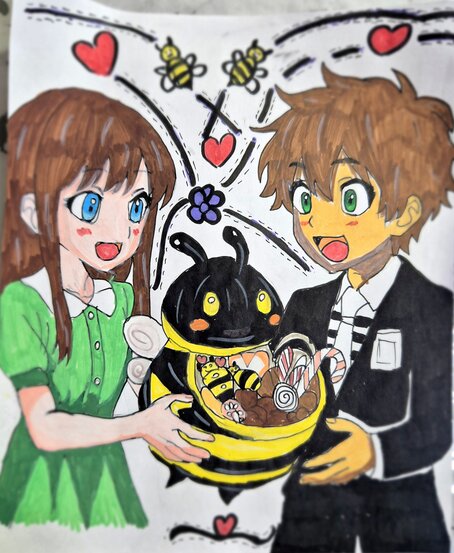 היי מיקמקים העלתי יצירה לבלוג הפרס מתואר ילדה שמביאה מתנה לכבוד השנה החדשה לחבר שלה והמתנה היא בצורת דבורה חמודה שבתוכו יש שוקולים דבורות וגם ממתקים וסוכריות ועשיתי את הילדים חגיגים וחמודים רואים בתמונה שהילד מופתע כי הוא ממש היה בעלם שחברה שלו הביאה לו מתנה לכבוד השנה החדשה בקיצור הם ממש שמחים ונרגשים לכבוד השנה החדשה מקווה שאהבתם אוהבת המופלאה25