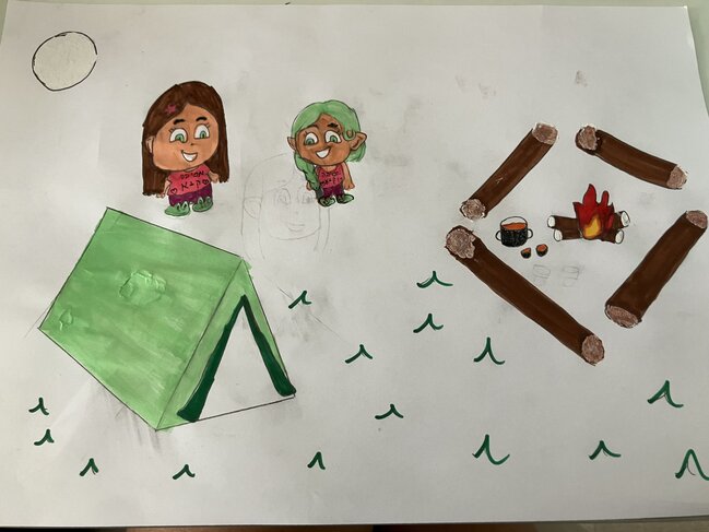 קורה הקטנה (עם השיער הירוק) הרגישה שעבר עליה שבוע קשה. אחותה הגדולה אלה (עם השיער החום) הרגישה שהיא רוצה לשפר את ההרגשה של קורה ולכן היא נסעה איתה לטיול קמפינג!! קורה שמחה נורא שהיא מבלה זמן עם אחותה והתרגשה מאוד תוך כמה שעות ירד הלילה וקורה ואלה בילו בנעימים בקמפינג. הם הקימו אוהל ברחבה גדולה של דשא, והם מצאו אזור עם מדורה ששם הדליקו אש ואכלו מרק כתום (האוכל האהוב על קורה) אבל רגע… זה עוד לא נגמר!! קורה שכחה את הפיג׳מות שלה! זה אסון! מזל שאלה הכינה הפתעה לקורה והוציאה להם חולצות פחג׳מה מיוחדות בצבע ורוד, הצבעים האהובים עליהם עם הכיתוב ״המסיבה של ק+א״ וזהו חברים תודה אם הגעתם עד לכאן, מוזמנים לתת תגובה ולייק השקעתי נורא ואני מאוד מאוד מאוד מקוה לזכותתת דרך אגב, את הציור ציירה אחותי הקטנה החמודה ביחד איתי