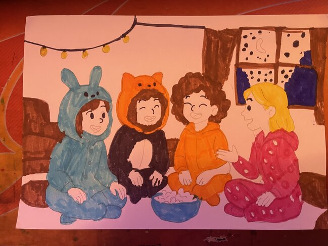 ✨ הרעיון של הציור: להראות את ה"כיף הביתי של החורף" – כשקר בחוץ, אבל בפנים חם, מלא חברים, וצחוק. הפיג'מות מדגישות את האופי של כל אחד ויוצרות אווירה משעשעת, צבעונית ומלאת אופי — בדיוק מה שהתחרות מבקשת