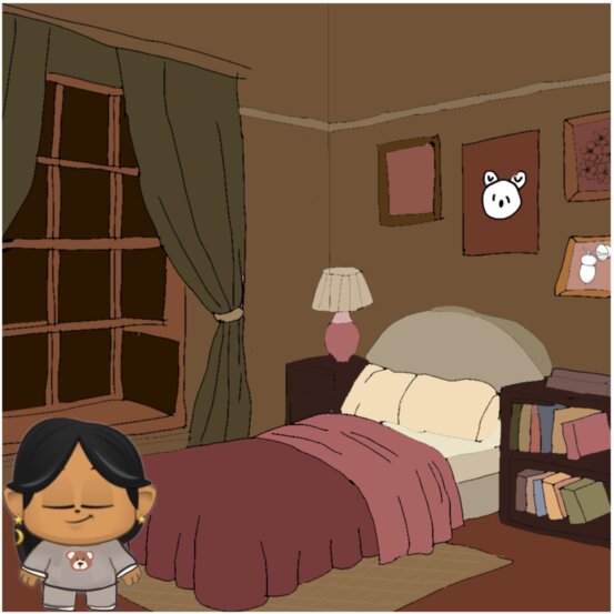 מאותו הרגע שראיתי את המשימה ידעתי מה לעשות, עבדתי לילות כימים וניסיתי לעשות אווירה נעימה כזו בסגנון צבעים חורפי מודרני. ניסיתי לשלב כמה שיותר סגנונות ופרטים קטנים בציור, למיקמקית שלי עשיתי פיג׳מה חמימה ונעימה וגדולה.