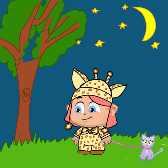 ציירתי פיג'מה ג'ירפה ואני מטיילת עם החתול שלי בלילה