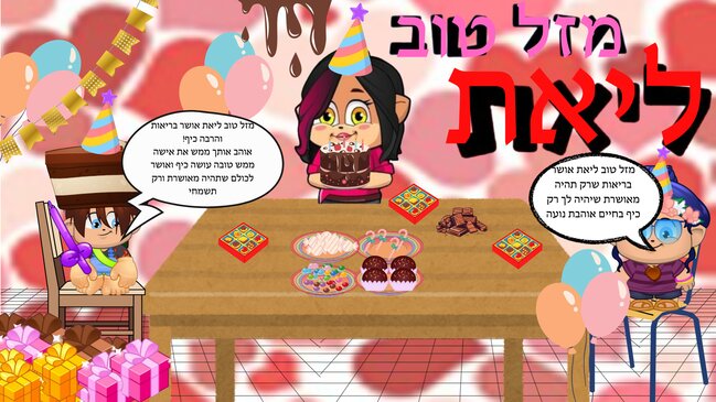 מזל טוב ליאת (לואי) יום הולדת שמח בריאות אושר שמחה שרק תהני כל החיים שיהיה לך חיים טובים מזל טוב את אישה מקסימה! וסופר נחמדה! מזל טוב מלא בלונים עוגות ושמחה! אוהב בוגסי10000!