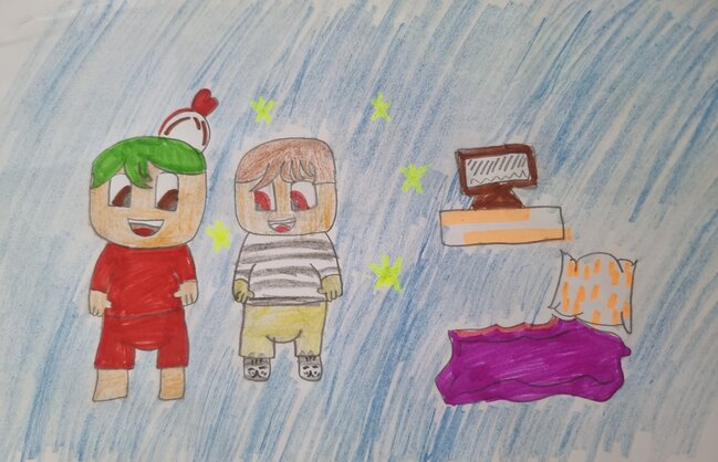 ציירתי שתי מיקמקים רקע שמיים וכוכבים עם כרית ושמיכה וטלויזיה