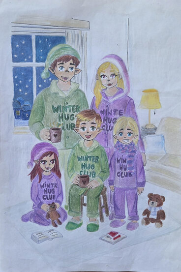 בציור נראית משפחה עם חמישה ילדים בסלון ביתי ומואר, בערב חורפי. מחוץ לחלון נשקף לילה מושלג, עם פתיתי שלג קטנים ושקטים, שמדגישים את הקור שבחוץ לעומת החום שבפנים. כל בני המשפחה לבושים בפיג’מות חורף תואמות בצבעי ירוק וסגול, עם הכיתוב “Winter Hug Club”, שמראה על אחדות ושייכות. חלקם מחזיקים ספלי משקה חם, מה שמוסיף לאווירה הביתית והמרגיעה. הדמויות מחייכות ובעלות הבעות שמחות ורגועות. הילדים יושבים ועומדים בנינוחות – אחד יושב על שרפרף, אחרים עומדים או יושבים על הרצפה. לידם יש פרטים קטנים שמעשירים את הסצנה: ספר פתוח, דובי צעצוע, מנורה דולקת וספה רכה ברקע.