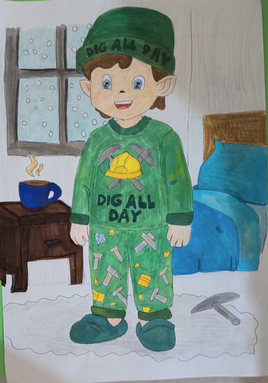 בתמונה מופיעה דמות ילד חמודה לבושה בפיג’מה חורפית בהשראת תחרות החפירות. החולצה בצבע ירוק עם איור של קסדת חפירות וכלים, ועליה הכיתוב *“DIG ALL DAY”**, שמסמל יום מלא חפירות והרפתקאות. המכנסיים מעוצבים בהדפס חוזר של פטישים, יהלומים וכלי חפירה – ממש כמו עולם החפירות של מיקמק, אבל בגרסה רכה ונעימה לשינה. הילד נועל נעלי בית עם פרווה ומוקף באווירה ביתית וחמימה, עם ספל משקה חם לידו וחלון שמראה חורף קריר בחוץ. היצירה מדגישה את הרעיון שאחרי יום של עבודה קשה וחפירות מגיע זמן מנוחה, חום ופיג’מה מפנקת. המשפט שעל הפיג’מה הסבר קצר .