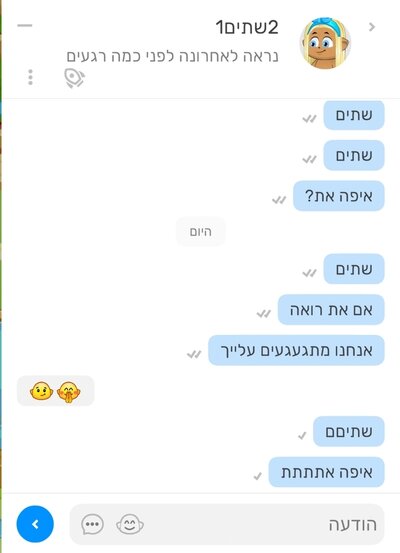 היי 2שתים1 הייצה מחוברת היום אז ברור ששלחתי לה הודעה והיא ענתה!! אני בשוק העלתי בשנייה שהיא ענתה זה כל כך מרגש אותי שהיא נעלמה לנו מהחיים וחזרה אחרי מלא זמן