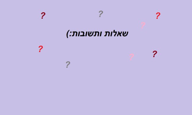 טוב אז מה דעתכם לשאול אותי שאלות ואני יענה אבל אני צריכה שנגיע להרבה שאלות בשביל שאני יוכל לענות על כולם בבת אחת יאלושש בהצלחה!!
