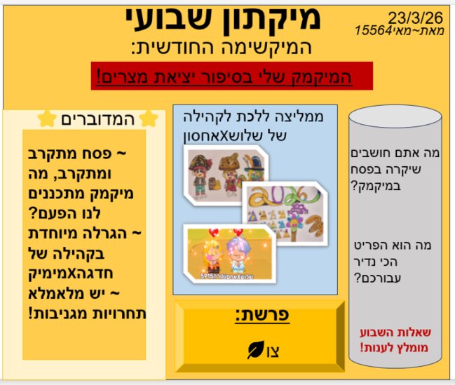והפעם בקהילה של מאיייייי----- מיקתון שבועי!!!!! בעיקרון.... עלון 6! *אבל* וזה אבל גדוללללל זה מהדורה חדשה דנדשה! מקווה ממששששששששששששששששששששששששששששש שתאהבו❤️ שלכם, מאי