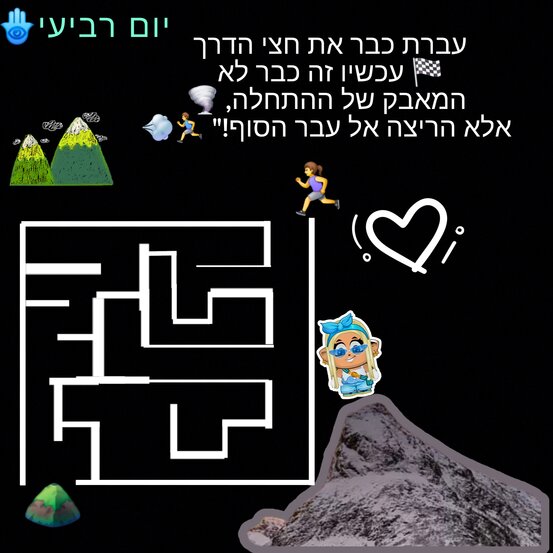 היי מה הולך איך אתם קולטים היום יום כבר רביעי איך הזמן טס והנה עוד משפט חיזוק תדמיינו שאתם מטפסים על הר גבוה מאוד כדי לראות את הנוף מלמעלה. כשמתחילים את הטיפוס, בתחתית ההר, הכל נראה נורא קשה. הרגליים קצת כואבות כי הן עוד לא רגילות, התיק מרגיש כבד, ואתם כל הזמן שואלים "מתי נגיע?". זה מה שנקרא המאבק של ההתחלה השלב שבו הכל חדש, מעייף וקצת מפחיד כי לא רואים עדיין את הסוף.עכשיו, כשאתם עומדים שם בחצי הדרך, תסתכלו רגע על הרגליים שלכם. הן כבר לא חלשות כמו שהיו בבוקר; הן הפכו לשריריות וחזקות מהטיפוס שעשיתם עד עכשיו. הלב שלכם כבר רגיל למאמץ, ואתם כבר מכירים את השביל – אתם יודעים איפה יש אבנים שצריך להיזהר מהן ואיפה הדרך נוחה. פתאום, אתם מגלים שהנוף מתחיל להיפתח. אתם כבר גבוהים מספיק כדי לראות את העמק למטה, ואתם רואים בבירור את הפסגה שנמצאת ממש לפניכם. המבט שלכם כבר לא תקוע באדמה מרוב קושי, אלא נשוי קדימה בביטחון. זו "הריצה אל הסוף": זה השלב שבו המאמץ הופך להנאה. אתם כבר לא "נלחמים" בהר, אתם "רוקדים" איתו. אתם רצים קדימה לא כי זה קל, אלא כי אתם הפכתם להיות חזקים יותר. אתם יודעים בדיוק לאן אתם הולכים, ואתם יודעים בוודאות שתגיעו. הקושי שהיה בהתחלה נעלם, ובמקומו באה ההתרגשות של הניצחון שמתקרב. בכל פעם שתתחילו משהו חדש – לימודים, חוג, או אפילו משחק קשה – תזכרו שההתחלה היא תמיד "מאבק". אבל אם לא תוותרו ותגיעו לחצי הדרך, אתם תגלו שאתם כבר אלופים, והחצי השני יהיה פשוט ריצה מהנה ומלאת גאווה עד לקו הסיום.