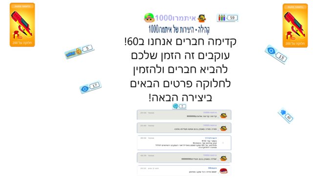 היי חברים אתם כבר ב-60 עוקבים אלופים אני סומך עליכים אתם תצליחו!!!!!!!!!!! להביא עוד עשרה חברים ותזכו!!!!! בהצלחה לכם