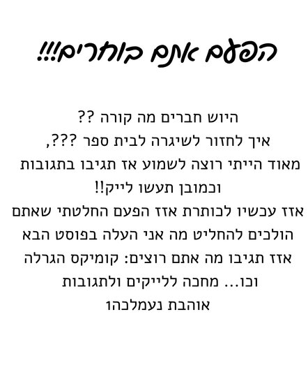 מהממת היה דווקא בסדר.. חוץ מזה שהמורה הכתיבה לנו את החייםםםץ.. התגעגעתי בכל זאת לחברות שלייי וואו אממ תעליי המלצהה!! זה ממש חם הנושא הזה חחחח |