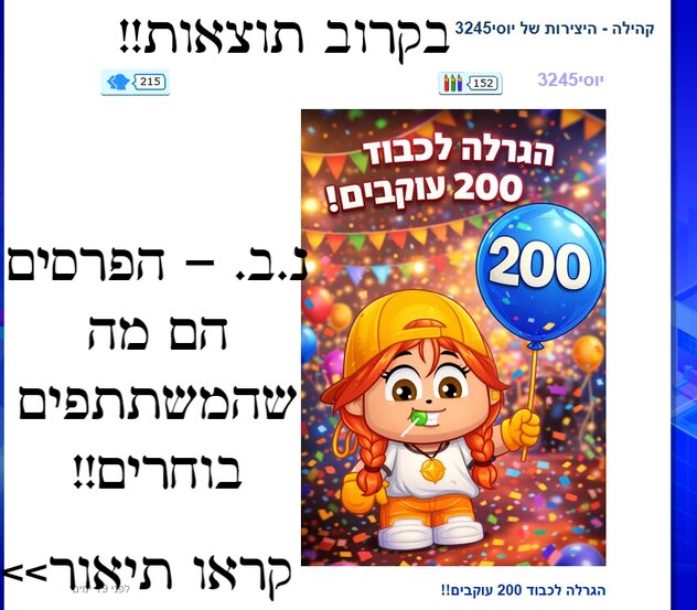 כנסו שמה ותעשו הכול ותכתבו גם כאן וגם שמה שעשיתם הכל!! וזהווו ולגבי הפרסים.. אז ככה כל מי שיכול לכתוב כאן למטה בתגובות מה הוא רוצה לזכות (חוץ משיער קים חחח מה לעשות פריט הכרחי..) ואם יזכה אז בע"ה אני אביא לו. שווה, לאא?? יאלושש בהצלחה לכוללםםם אוהבתתת יוסי3245 ~רון~ ❤❤