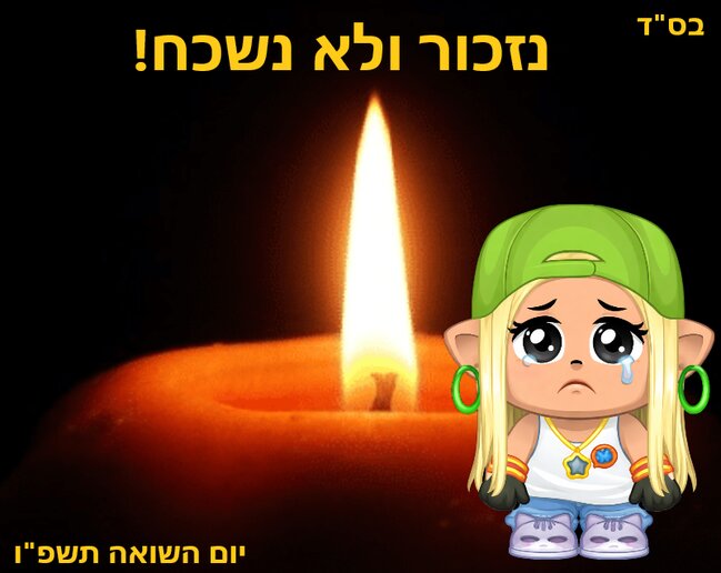 בס"ד שלום לכולם. היום הוא יום השואה. לא נשכח את כל הנאצים ותומכיהם אשר רצחו 6 מיליון יהודים - זקנים, נשים, גברים, וילדים. בכל דור ודור יש עם או כמה שרודפים אחרינו... "והיא שעמדה"? מי עמדה לנו? מי? מה שעמד ושעומד לנו - זה הברית. הברית שאברהם עשה עם ה', בה הבטיח לנו שנישאר עם שלם לנצח. האמונה תדבק בנו לאורך כל הדרך עד לגאולה, הברית תזכר לנו לעד. הסתכלו סביבכם. כל היופי שאתם רואים בעיקר בזכות ניצולי השואה, שקמו מהעפר, והקימו מדינה לתפארת. בימים כאלו מה שיתן בנו כוח יהיה האמונה! התקווה! שניצולי השואה וגם נרצחי השואה השאירו בתוך לב ליבם ולא וויתרו!! יהי רצון שכל הזמן נדבק רק באמונה!! ושתגיע הגאולה!! תודה רבה שהקשבתם לי! אוהבת יוסי3245 ~רון~ #נזכור_ולא_נסלח_! ______________________________________