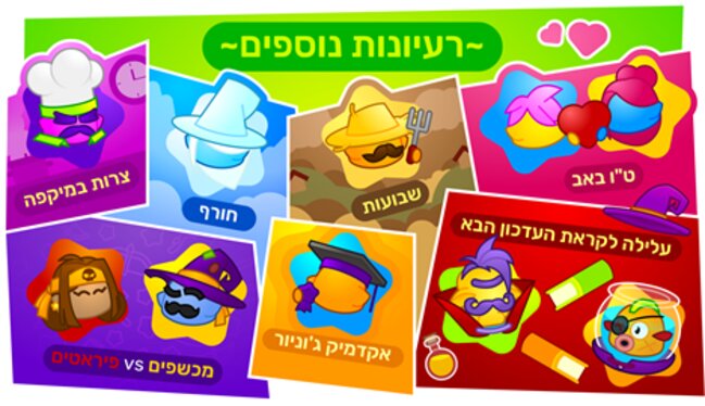 אחד הדברים שיכולים להיות מגניבים הוא דמויות עם משימות שקשורות לחגים, כמו למשל זוג אוהבים עם משימת ט"ו באב מגניבה, או חקלאי עם משימה לכבוד חג שבועות!