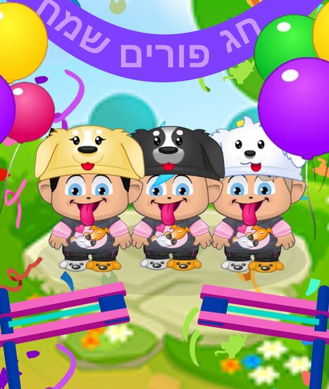 הכנתי יצירה של אני ושני חברים שלי ממיקמק 2 מצטלמים בגבעה שמקושטת לחג פורים במיקמק 2 .הרעיון שלי היה להתחפש לכלבים חמודים אז כל אחד קיבל כובע שונה שהתחפושת שלו תהיה יחודית