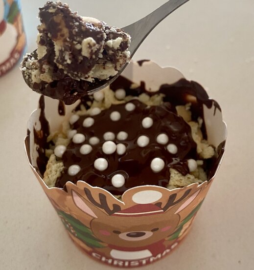 • קחו כוס בגודל של שלי גג • קחו פתיבר אחד או שתיים תפרקו אותו ותשימו אותו בכוס הקטנה • תמיסו קצת שוקולד במיקרוגל ל25 שניות ותשימו על הפתיבר שכבה קטנה ותשמרו עוד קצת מהשוקולד המומס • תעשו עוד שכבה של פתיבר • שימו את השוקולד שהשארתם על השכבה השנייה של הפתיבר אבל לא לכסות הכל • תוסיפו על השוקולד קצת סוכריות