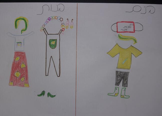לבנים: -מסכה אדומה- חג סוכות שמח (המסכה משולבת לבנים ולבנות.) - שיער בלורית בצבעים ירוק וצהוב. - חולצה בצבע צהוב מנצנץ עם ציור של לולב עליה. - מכנסיים שחורים קצרים מקושטים בלולבים. - נעלי אולסטאר ירוקות עם שרוכים אפורים וקישוט אתרוג בצד כל נעל.