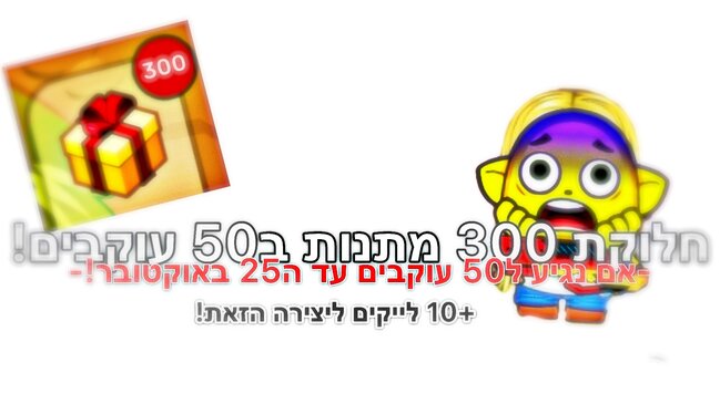 היי חתולים שלי! אז כמו שאפשר לקרוא ביצירה שלי, אם נגיע ל50 עוקבים עד ה25.10 (עשרה ימים), ול10 לייקים ביצירה הזאת אני עושה חלוק של 300 מתנות! כן זה מטורף! ויכול להיות שיהיו אפילו יותר אז שווה לכם לעקוב! תשתפו לחברים את היצירה,תשלחו למיקטוק שיעקבו, כל דבר שיעזור לכם להגיע ל50 עוקבים ו10 לייקים פה!