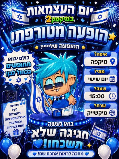 במיקמק 2 אנחנו חוגגים כמו שצריך עם אווירה מטורפת, צחוקים, סטיילים מיוחדים ואירועים שווים זה הזמן להיכנס, לפגוש חברים, להחליף לוקים ולהראות לכולם את הסטייל שלכם ✨ אולי גם יחכו הפתעות… אז שווה להיות מחוברים חשובבבב כולם באים מחופשים בכחול-לבן!!! וגם אני כמובן אגיע בלוק חגיגי במיוחד ✨ והשיא של היום — הופעה של שימי!!! איפה? מיקפה מתי? יום שישי ⏰ שעה? 15:00 שרת: מיקשייק אחרי ההופעהההה כולנו הולכים לבריכה!!! ואני זורק 4 מתנות מי שתופס — תופס