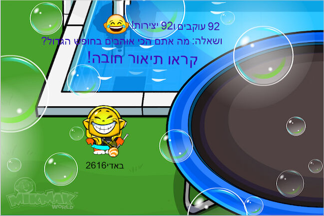 היי כולם אז כפי שראיתם יש לי 92 עוקבים ו92 יצירות אז יש לי דברים לשאול אותם האם אתם רוצים הגרלה ב100 עוקבים? ועל איזה פריט? תירשמו בתגובות אולי אני יעשה חלוק נדירים גם ב100 עוקבים תלוי בכם טוב לפני שנסיים אני ממליצה על קהילה: בינדי1243 היא ממש אבל ממש משקיעה כדי לכם תנו לה עוקב לייק ותגובה (כמובן גם לי) טוב ביי באדים שלי:)