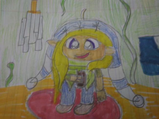 תיאור יצירה : המיקמק שלי שותה שוקו חם, בסלון