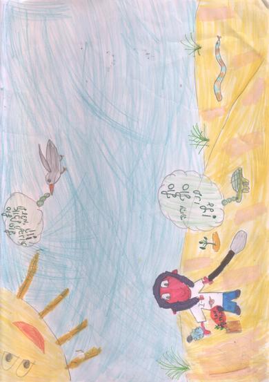 הציפור בציור אומרת: "סוף סוף אוכל לבנות לעצמי קן"! הצב אומר:"סוף סוף יהיה לנו עץ" ! העציץ שואל:"מתי תורנו"!?