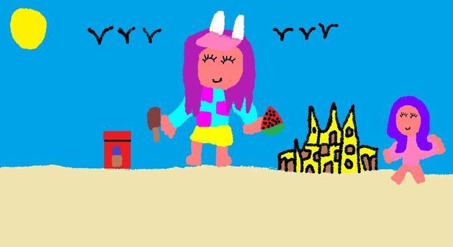 המיקמקית שלי מבלה בחוף הים שהיא אוכלת ארטיק ואבטיח , ובתיק יש קרם הגנה. ובצד אחותה הקטנה שבנתה ארמון בחול.