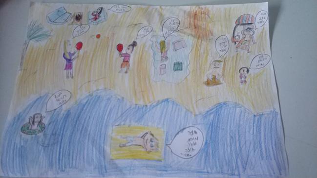 אז היי אני ציירתי אותי ואת המשפחה שלי כמו שאתם רואים אני על מזרן ודודה שלי הקטנה על גלגל דוד שלי והבת שלו בונים ארמון חול אמא שלי משתזפת אבא שלי על הכיסא גם כן משתזף דודות שלי משחקות פינק פונק ועוד דודה אוכלת אבטיחים וזה ממש כיף