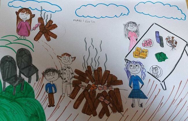 אני ציירתי את המשפחה והחברים שלי נהנים בלג בעומר , ביחד סביב המדורה , לידנו יש שולחן עם חטיפים ועל האש , אנחנו צולעים מרשמלו ותפוחי אדמה