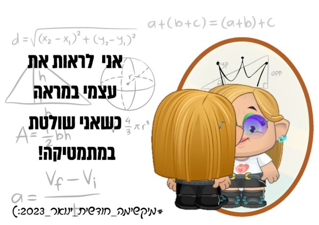 חשבתי שהגבתי לזה אבל מסתבר שלא, אז אגיב על זה עכשיו. מזווית העין שלי זה מקסים שזאת המשאלה שלך למראה, וזה מעיד על המוטיבציה ועל הרצון שלך. ותאמיני לי- כשיש מוטיבציה ורצון- השמיים הם הגבול!!❤❤ כל הכבוד שאת מתאמצת להקשיב בשיעוריםםם זה אפשרי! ואת תצליחי, אני בטוחה שעם מוטיבציה ורצון שכזה את תצליחי. בהצלחה בתחרות וכמובן, במתמטיקה!❤❤ |