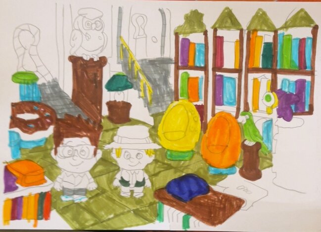 היי, זאת היצירה שלי לתחרות "ספריית ההרפתקאות"! עשיתי ספרייה מגניבה עם מלא דברים שווים – יש שם כורסאות בצורת ביצי הפתעה, ספה ענקית בצורת דונאט, ינשוף חכם ותוכי ירוק שעוזרים למצוא ספרים. יש גם בלאסטר מיוחד שמאיר ספרים נדירים על המדף, וגם מחלקה מוגבלת שנועלת ספרים סודיים עם שלט "מוגבל".