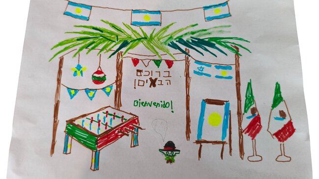 אני ציירתי סוכה עם קישוטים לאורחים שלנו וציירתי מישהו ממקסיקו מגיע לא יצא ממש טוב אבל מקווה שתסתכלו על הקנקנן ולא על מה שבתוכו