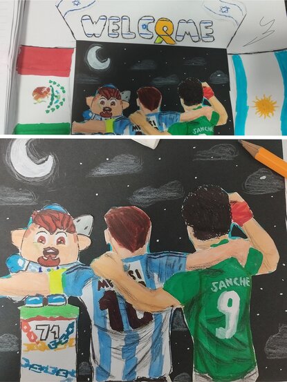 עשיתי ציור למיקשימה של קבלת הפנים של מקסיקו וארגנטינה. בציור יש את המיק שלי עם כיפה שאני עיצבתי,משחק בTOWERS סוכות והוא עושה שלום למסי והוגו סאנצא'ז שהוא שחקן מקסיקני,ברקע יש דגלים של ישראל ארגנטינה ומקסיקו והכיתוב WELCOME(ברוכים הבאים). וזהו, השקעתי הרבה מקווה לזכות למרות שיש פה מלא ציורים טובים. וזהו, תודה לכולם.