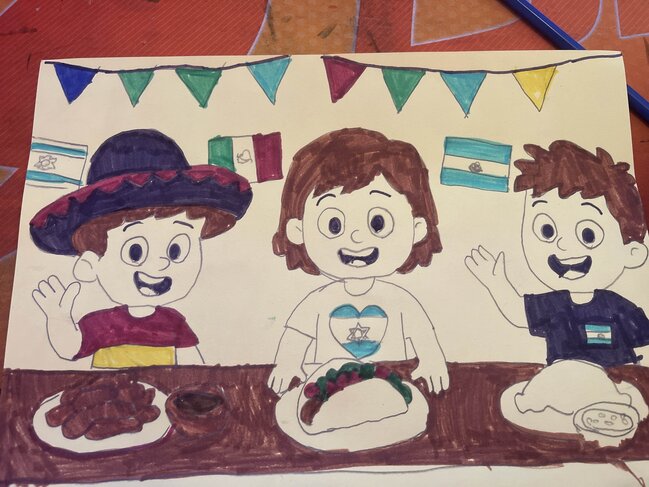 בתמונה רואים שלושה דמויות מצוירות (בסגנון מיקמק) יושבות סביב שולחנות בחגיגת קבלת פנים. מצד שמאל יושבים שניים – אחד בלבוש כחול־לבן עם פרחים וסמלים מארגנטינה, והשני בבגדים אדומים עם כובע סומבררו מקסיקני. מימין יושב מיקמק בלבוש ישראלי שמניף דגל ישראל בגאווה, עם כובע שחור וחגורה כחולה.