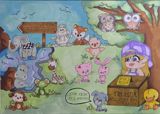 “בחרתי ליצור בוטיק מסוג אחר מקום שבו האהבה לא נקנית, והסכום הקטן שמבקשים הוא רק כדי לאפשר להציל עוד ועוד לבבות שמחפשים בית.” בעולם שבו הכול נמכר ונקנה, אני בחרתי ליצור מקום קטן שבו האהבה לא מגיעה עם תג מחיר. הבוטיק שלי הוא לא חנות רגילה הוא מרחב של חמלה, תקווה והזדמנות חדשה. במקום מדפים נוצצים ומבצעי סייל, תחכו כאן נשמות קטנות שמבקשות רק דבר אחד: בית חם ולב שיאהב אותן באמת. בחרתי לעצב גינה פתוחה, טבעית וצבעונית, שמאפשרת לכל בעל חיים להרגיש חופשי, מוגן ושייך. הם יושבים יחד, כל אחד עם האופי הייחודי שלו חמודים, מצחיקים, עדינים או שובבים וכל אחד מהם מספר סיפור קטן של חלום: למצוא מישהו שיאמץ, שיראה אותם, שיבחר בהם. השלט “אהבה אינה למכירה אלא לאימוץ” מייצג את המסר המרכזי שלי: חברות אמיתית לא קונים. היא מתנה שמקבלים ברגע שבוחרים לפתוח את הלב. כל חיה בציור קיבלה מקום משלה הפיל על שפת הנהר, השועל, הג'ירפה, הכלבלב שמבקש “אמצו אותי”, הארנב והחתול שמחפשים חיבוק. כולם שונים, אבל לכולם יש דבר אחד משותף: הם מחכים לאהבה שתראה אותם מעבר למראה או לצבע. בבוטיק שלי, כל אחד מהם הוא “פריט יוקרתי” לא בגלל שהם לאימוץ, אלא בגלל הערך העצום שיש לכל חיים. המיקמק שלי עומד ליד דלפק האימוץ, לא כדי “למכור” חיות, אלא כדי להזמין אנשים לגלות כמה טוב יוצא לעולם כשבוחרים לאמץ. זה המקום שבו החמלה הופכת לפעולה, והבחירה מקבלת משמעות. הציור הזה הוא ההזדמנות שלי להזכיר לכולם: כשמאמצים בעל חיים מצילים לב אחד קטן, אבל גם מרפאים חלק גדול בלב שלנו. אני רוצה להודות לכל החברים שתומכים בי אני קוראת כל תגובה ותגובה תודה רבה לכם זה נותן לי כוח להמשיך לצייר
