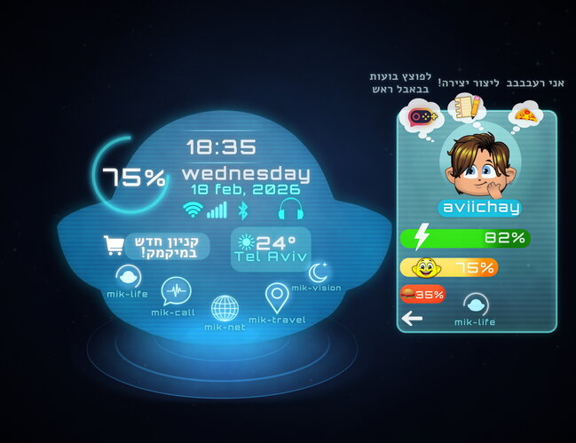 בדומה ליצירה הקודמת שלי, גם הפעם בחרתי ללכת על כיוון עתידני וחשבתי לעצמי… איך ייראה מסך הבית של המיקמק שלי בעתיד? לא טלפון רגיל עם אפליקציות, אלא משהו הרבה יותר מתקדם ושונה ממה שאנחנו מכירים היום.